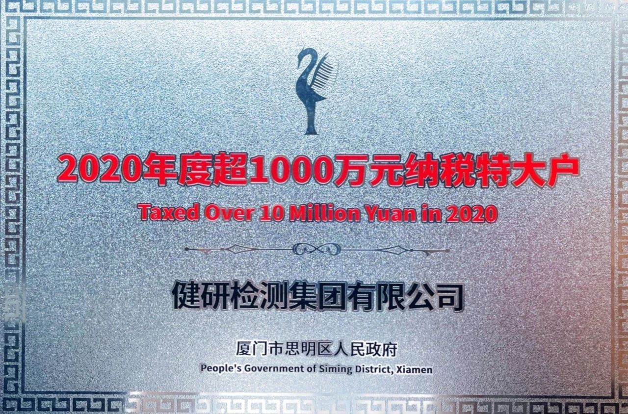 克日,,,,,,,中共思明区委、思明区人民政府对2020年纳税先进企业举行表扬。。。。。z6com官网登录入口集团、厦门建研购商业有限公司获“2020年度纳税大户”称呼。。。。。健研检测集团获“2020年度超1000万元纳税特大户”称呼,,,,,,,此为健研检测集团一连13年获此称呼。。。。。z6com官网登录入口集团提倡“爱员工、爱公司、爱社会”,,,,,,,是社会财产的孝顺者。。。。。